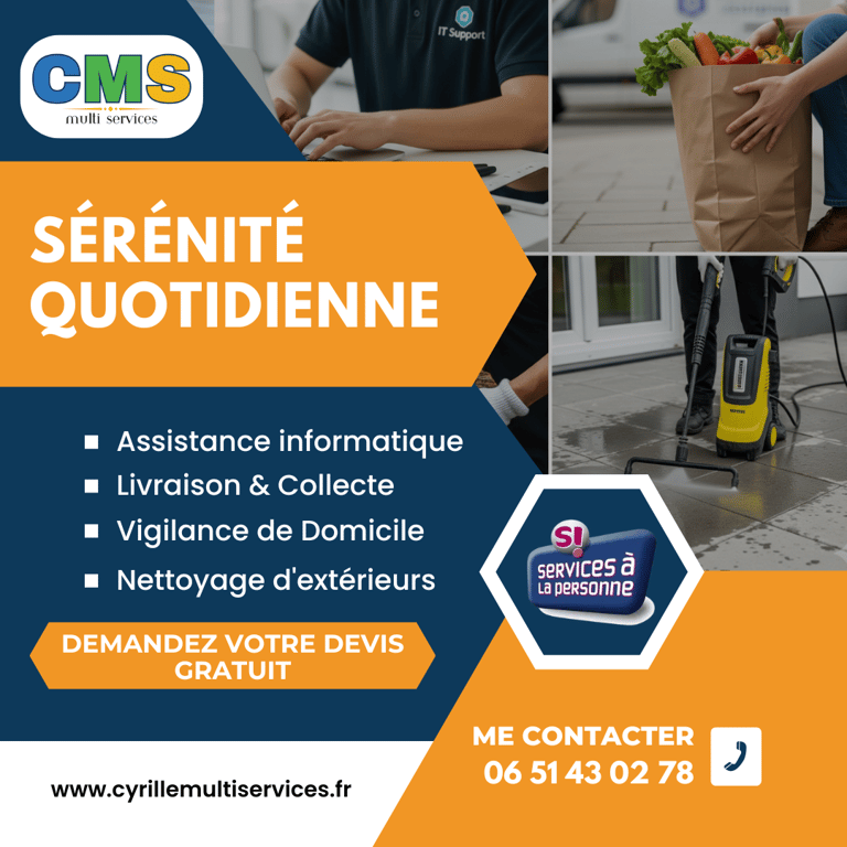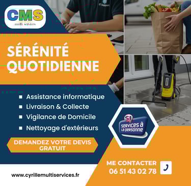 Pour vous libérer des contraintes du quotidien, mon Pack Sérénité regroupe assistance informatique, livraison/collecte et vigilance de domicile selon vos besoins spécifiques.